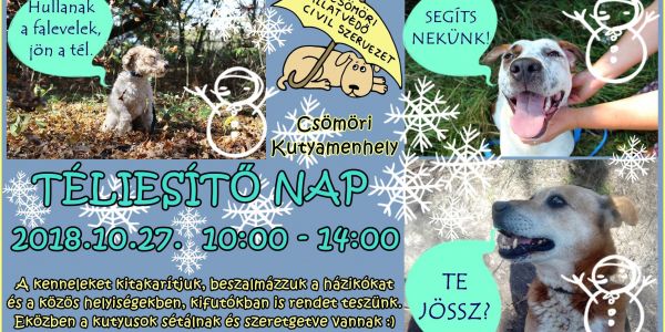 Téliesítő Napot tartunk a menhelyen, amikor felkészítjük a kenneleket a hidegebb napokra és rendet teszünk a kifutókban, közös helyiségekben. Elsősorban tettre kész segítőket várunk felnőttek személyében. A kutyusok eközben sétálnak és persze ilyenkor is sok szeretetet kapnak 🙂 .